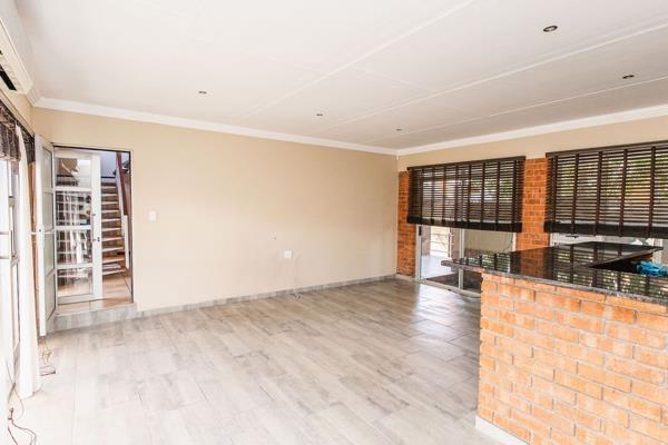 The home welcomes you into an exceptional open-concept entertainment and living zone featuring a built-in bar, TV lounge, and sliding-door flow to the outdoors. Enjoy an all-weather lifestyle with a louvre-covered patio and braai area, complemented by low-maintenance artificial grass for water efficiency. The sleek open-plan kitchen offers a breakfast nook and separate scullery. Downstairs features a comfortable bedroom with its own bathroom fitted with a shower, toilet, and basin ideal for guests, teenagers, or extended family.