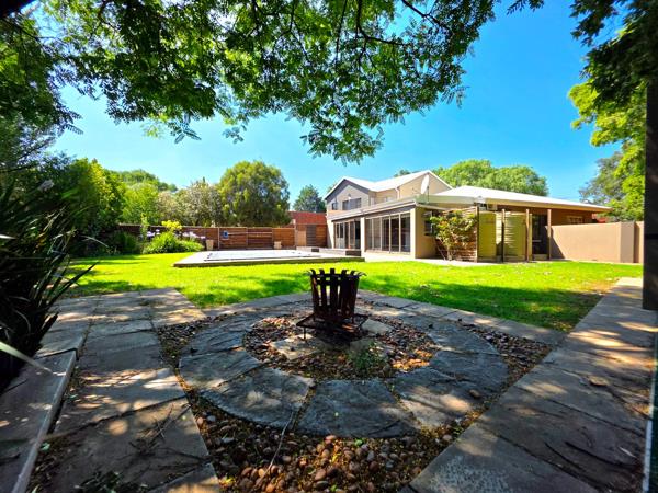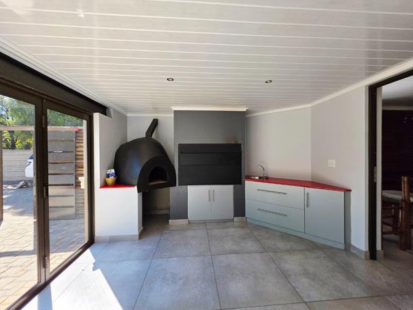 The entertainment area is a standout feature, overlooking the sparkling swimming pool and immaculate garden. Designed for year-round enjoyment, it includes a built-in braai, built-in pizza oven, stacking doors, and a stylish built-in bar.
