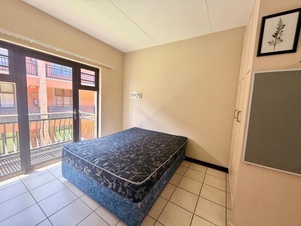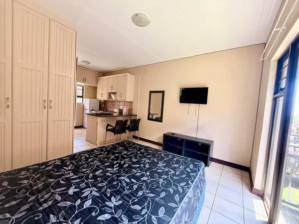The unit features an open-plan kitchen, living and sleeping area with ample cupboard space and appliances. The apartment is fully tiled and includes a private bathroom.
