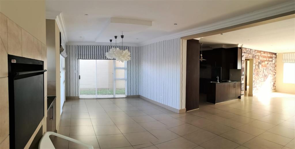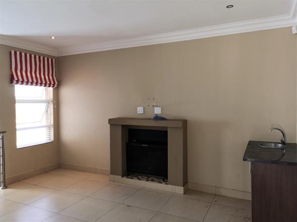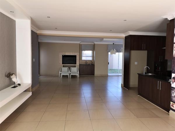 Downstairs is a huge living area with TV-room, dining room with built-in braai and sliding doors to garden. The kitchen has granite tops, space for your double door fridge, eye-level oven, hob and extractor fan. The double garage is automated and enters directly into your unit. The first bedroom and one bathroom are also on ground floor. When you follow the easy steps to the top floor, you enter a lovely pajama lounge with a fireplace and a small basin for a coffee station. From there are three bedrooms, 2 with aircons, and two full bathrooms. All the bedrooms are king-size and the main bedroom president-size with full en-suite bathroom. All three bedrooms have sliding doors to balconies and the whole unit is tiled, with quality blinds and stunning wall paper. Brilliant opportunity!