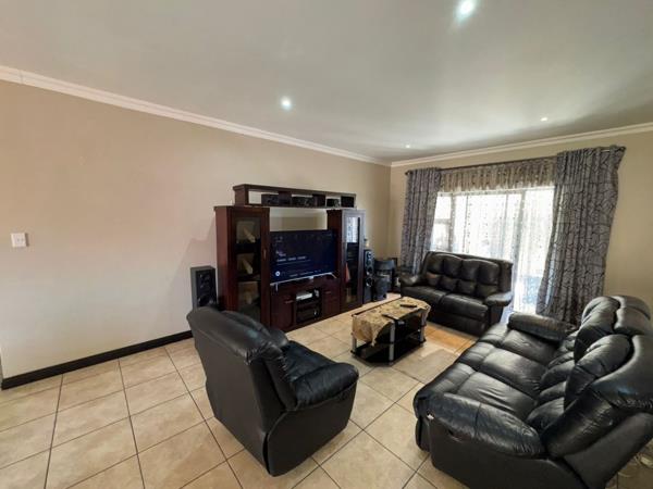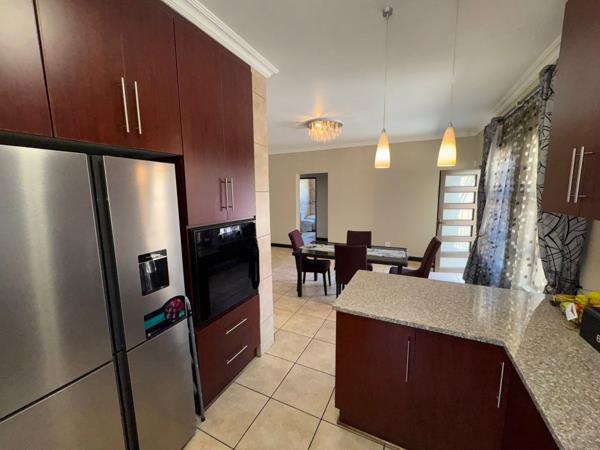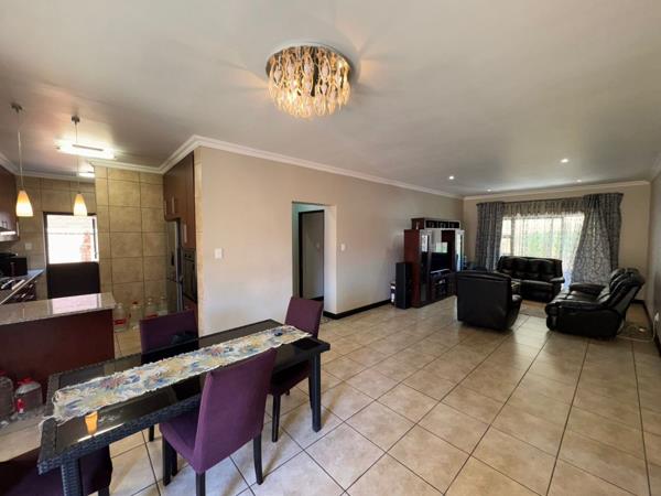 The home offers three spacious bedrooms with built-in wardrobes and laminated flooring, two modern bathrooms (including a main en-suite), and an open-plan living area that connects the kitchen, dining, and lounge spaces effortlessly.