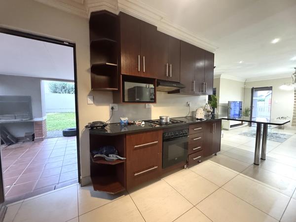 For those who enjoy entertaining, the home features a covered patio with a built-in braai, overlooking a generously sized private garden ideal for gatherings or relaxing in a tranquil setting.