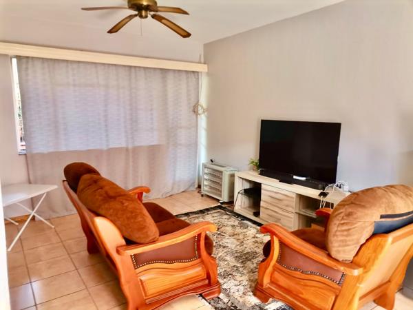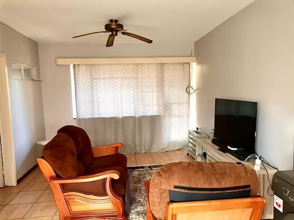 Open plan kitchen with lounge & dining room leading to an enclosed stoep overlooking the communal garden.