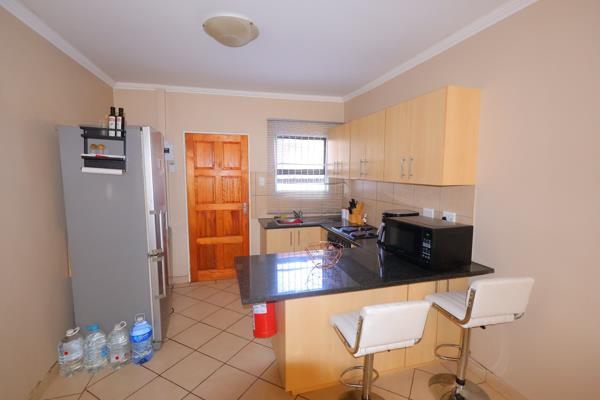 The open-plan apartment has a modern kitchen with granite tops, a built-in stove and built-in cupboards for plenty of storage space.