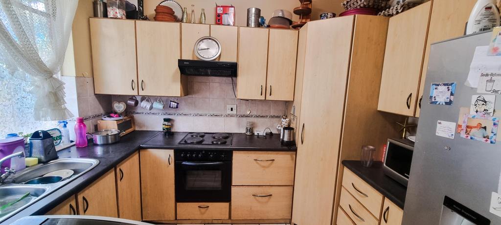 To the left, youll find a well-designed kitchen with built-in cupboards, a hob and oven, fittings for a washing machine, and space for a fridge.