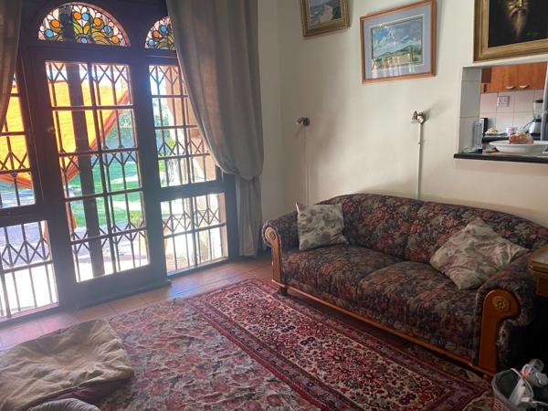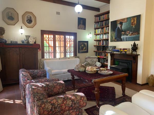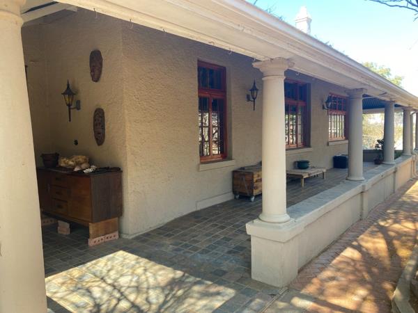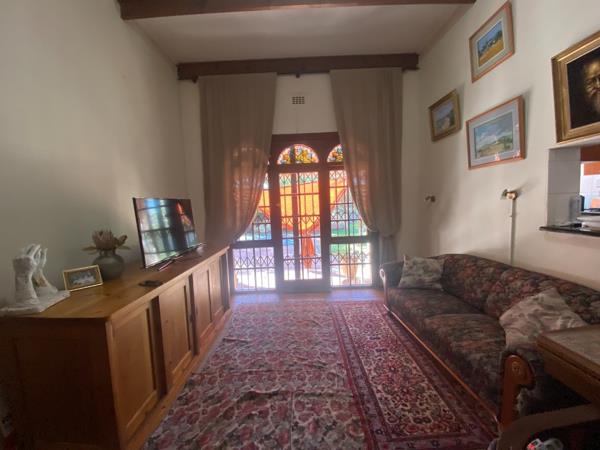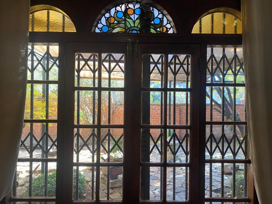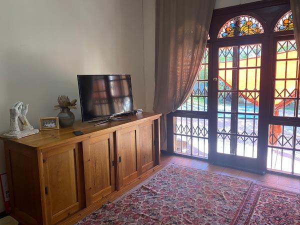 Expansive living area opening through stained-glass doors onto a wraparound stoep, ideal for morning coffee or sunset relaxation.