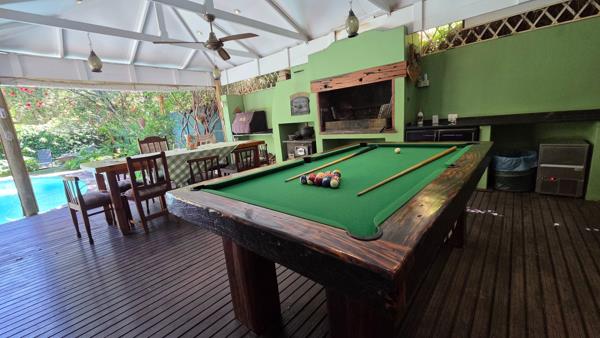 The entertainment area is designed for making memories: a covered patio with a built-in braai and pizza oven overlooking a sparkling pool and lush, established garden.
