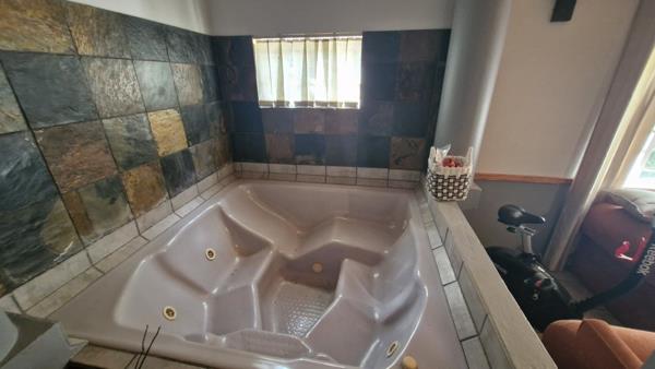 Additional highlights include a double garage with electric doors, a dedicated entertainment area with a built-in braai, a jacuzzi, a pool, a borehole, a JoJo tank with a pressure pump, and a spacious yard.