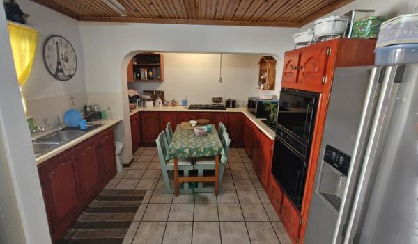 The well-appointed kitchen offers ample cabinet space, generous countertops, and a separate scullery equipped with laundry and dishwasher connections, seamlessly flowing into the dining room and lounge.
