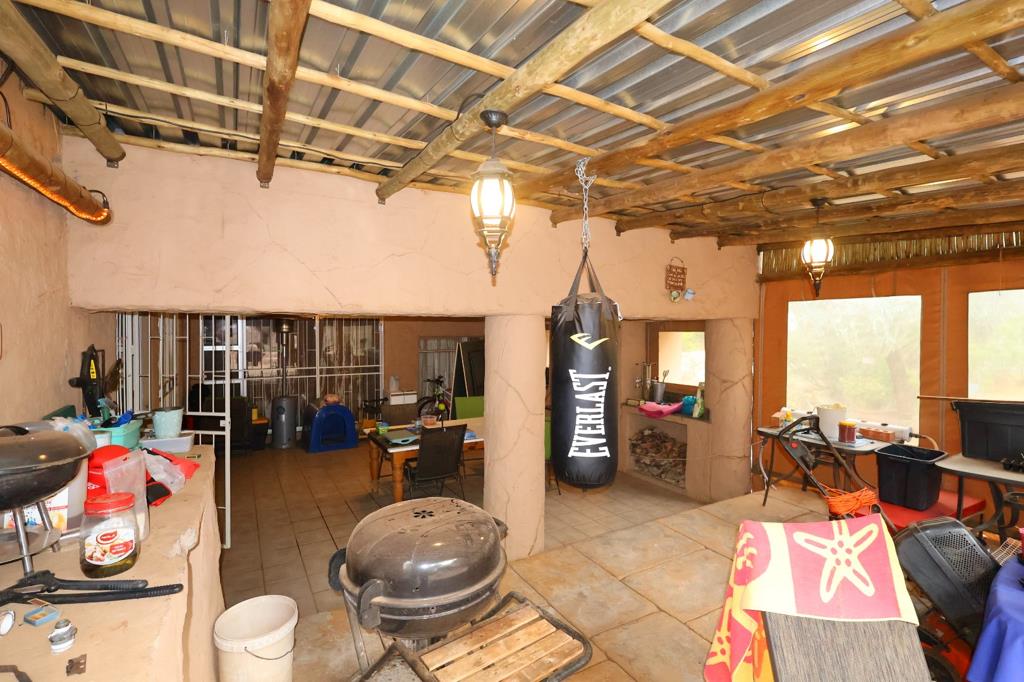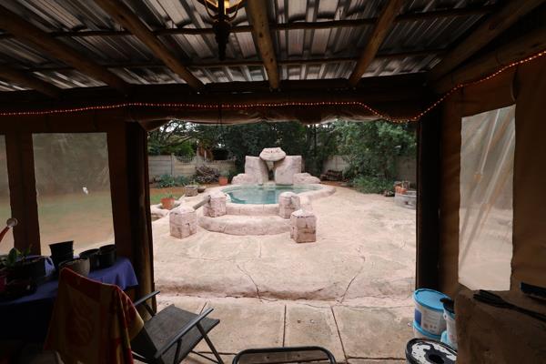 Large enclosed entertainment area with built-in braai, leading to the pool and spacious backyard