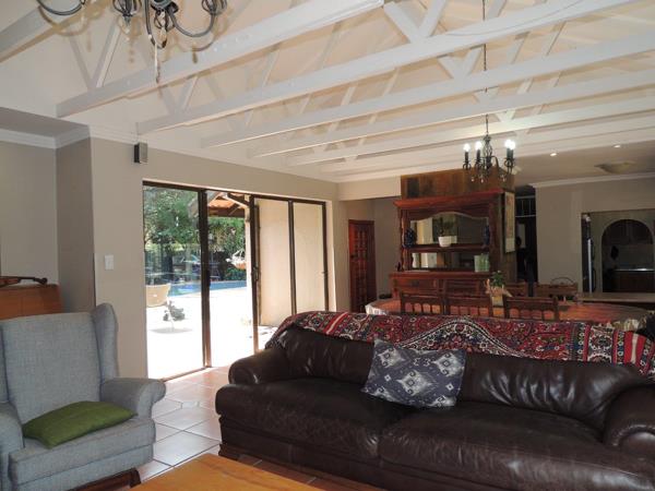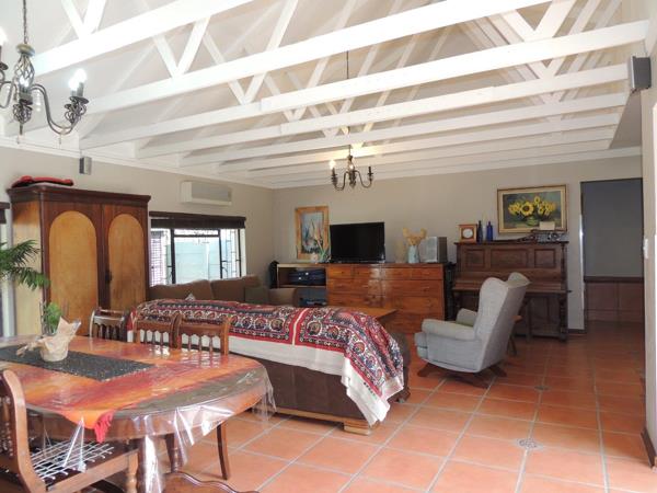 The heart of the home is the inviting open-plan layout, where the well-designed kitchen with separate scullery flows seamlessly into the dining and lounge areas. For those who love to entertain, the expansive living space extends outdoors to a large lapa with a built-in braai, overlooking the sparkling swimming pool the perfect setting for year-round gatherings.