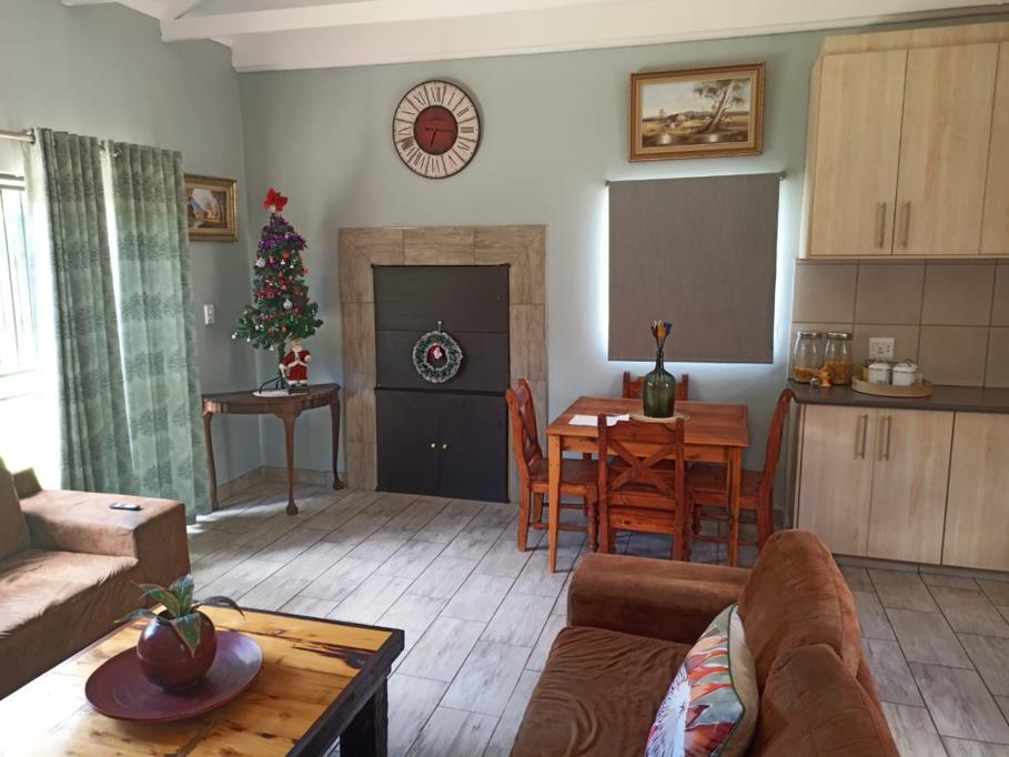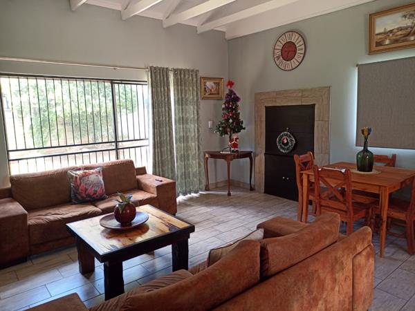 Spanning 110 sqm on a 627 sqm erf, this residence features an open-plan layout with high vaulted ceilings and exposed trusses, enhancing the sense of space. The modern kitchen boasts light wood cabinetry, dark countertops, and build-in stove, flowing seamlessly into the dining and lounge areas. Enjoy comfortable living with tiled flooring throughout and a dedicated entertainment setup. Security bars on windows provide peace of mind.