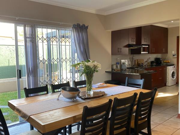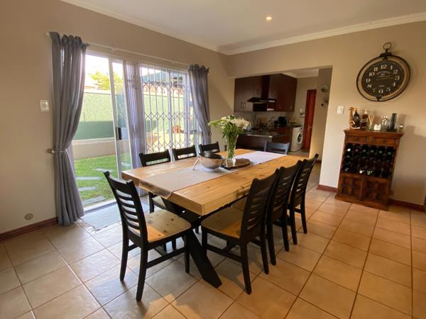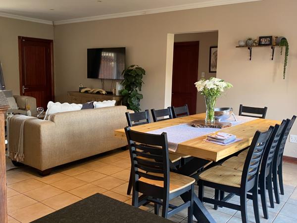 Open-plan dining and living area that flows out to a well-maintained garden and covered patio perfect for entertaining or relaxin