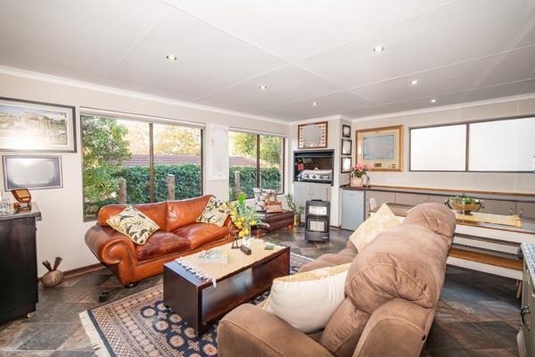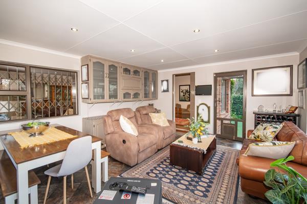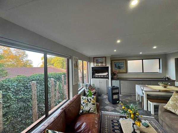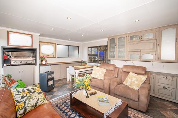 The home features an open-plan lounge and dining area that flows effortlessly into the kitchen, complete with a separate scullery designed for easy living and entertaining. A well-appointed indoor braai room with a built-in braai leads to a private, low-maintenance garden, making it perfect for relaxed get-togethers.