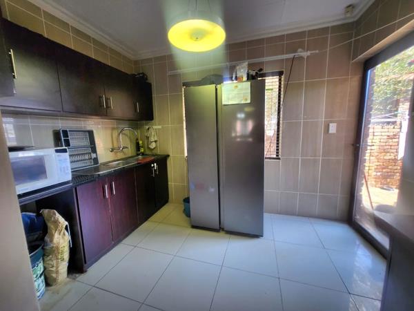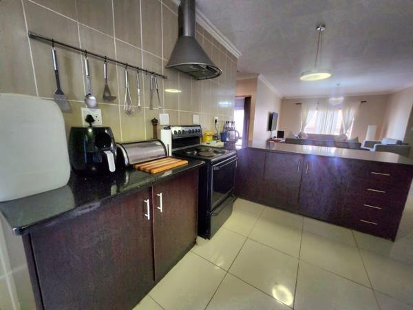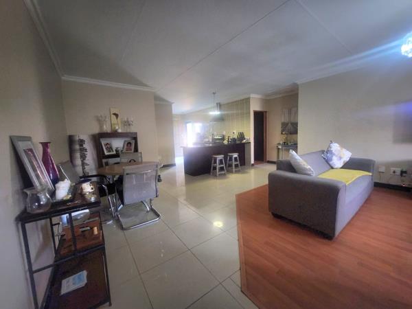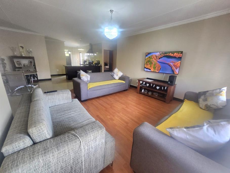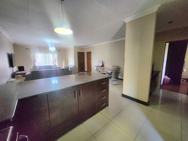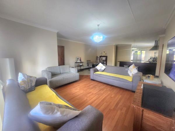 The open-plan living and dining area flows seamlessly into the modern kitchen, creating a warm and inviting space for family living or entertaining. From the living room, step out onto a wooden deck where panoramic views of Bloemfontein stretch before youperfect for sundowners or quiet mornings.