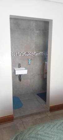 The beautifully tiled kitchen has stunning tabletops, ample sleek and sophisticated cupboard and cooking space and flows outs effortlessly onto the open plan living areas which compromises of a lounge and dining area. The living area has a sliding door which leads out to the private walled garden.