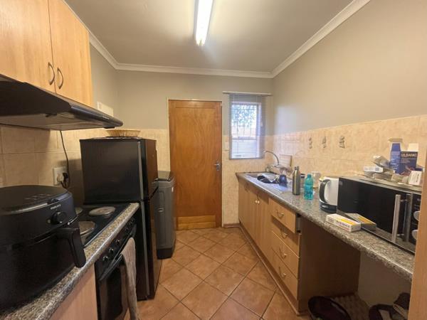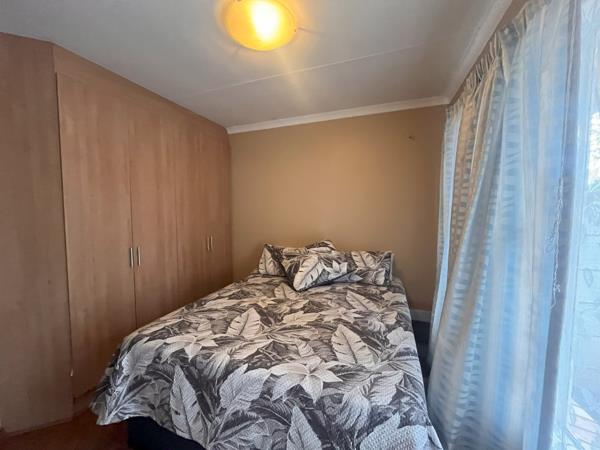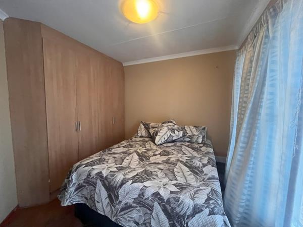 This home features two spacious bedrooms, both with tiled floors and built-in cupboards, offering comfort and practicality. The kitchen is neat and well-designed, equipped with built-in cupboards and tiled floors, making meal preparation a breeze.
