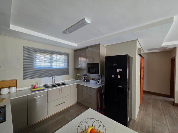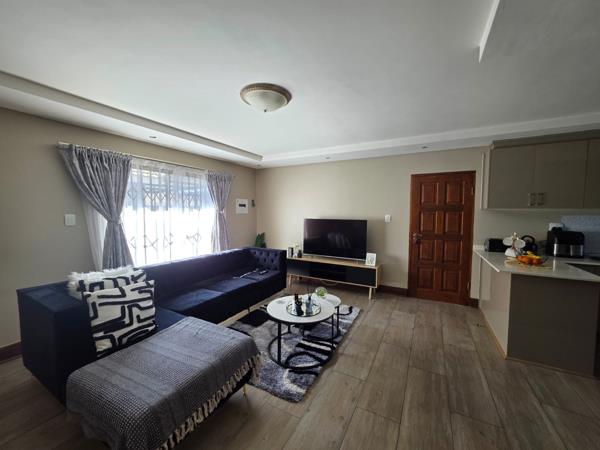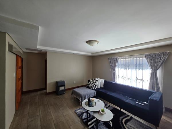Inside, youll find two tiled bedrooms with built-in cupboards, curtain rails, and burglar bars for peace of mind. The main bedroom features an ensuite bathroom with a shower, toilet, and basin, while the stylish guest bathroom includes a barn door, bath, toilet, basin, built-in cupboard, and convenient washing machine connection.