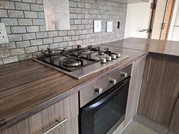 The home features three spacious bedrooms, all with built-in cupboards, and two well-appointed bathrooms, including a full family bathroom with a bath, shower, toilet, and basin. The open-plan living and dining area flows seamlessly into a well-equipped kitchen, complete with ample cupboard space, a gas hob, electric oven, and a handy breakfast nook.