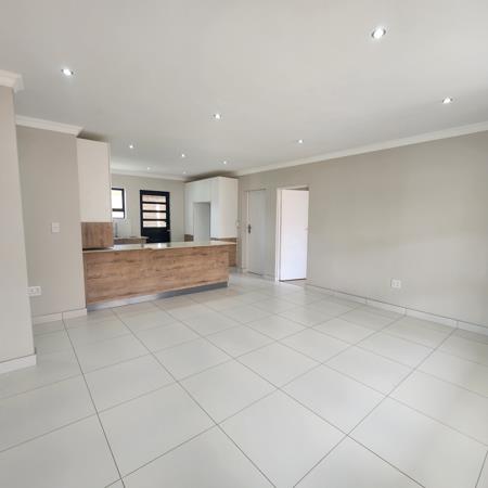 The house offers three generous bedrooms with built-in cupboards, including a main bedroom with a private en-suite. The modern kitchen boasts ample storage, a stove with oven and hob, and elegant marble countertops, creating a sophisticated space for cooking and entertaining. The open-plan lounge flows seamlessly onto a welcoming porch, perfect for relaxing or hosting guests.