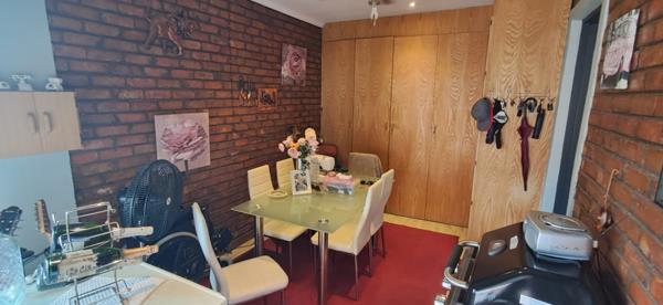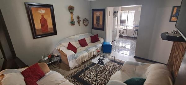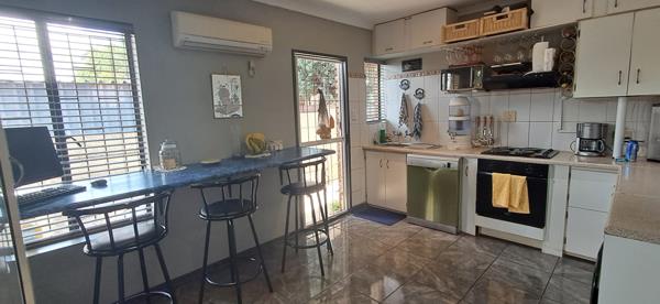 The cozy lounge boasts a built-in fireplace and offers access to the front patio, complete with a built-in braai area and a designated space for one covered parking. The living room flows into a hallway that leads to the three bedrooms, each offering ample natural light through large windows. The second bedroom also includes an air conditioning unit for added comfort. The main bedroom is a sanctuary with its own air conditioning unit and expansive windows, creating a serene retreat. The bathroom is fully equipped with a shower, bathtub, basin, and toilet, providing a luxurious experience for residents.