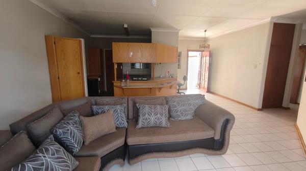 Step inside to find a bright and spacious open-plan living area that seamlessly integrates the lounge, dining room, and kitchen. The well-appointed kitchen showcases built-in cupboards, tiled flooring, and a charming breakfast nook, perfect for easy meal preparation.