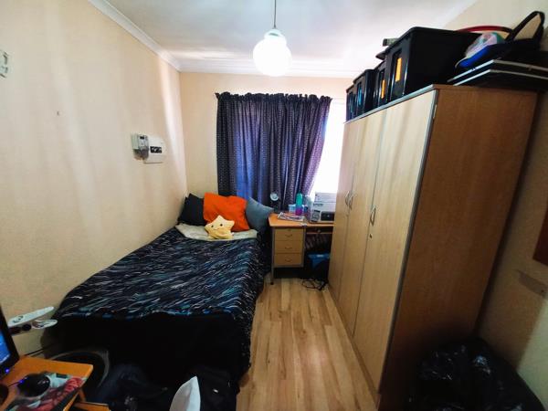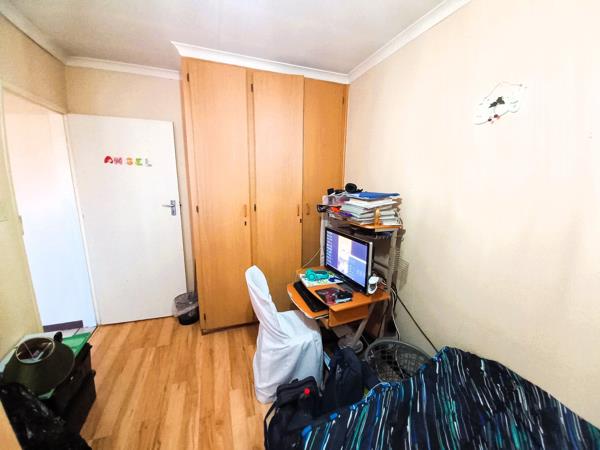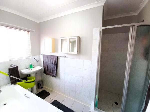 Both bedrooms feature laminated floors and built-in cupboards. The bathroom includes a bath and shower, with a separate toilet for added convenience. At the back, youll find a small private courtyard with space for a washing line.