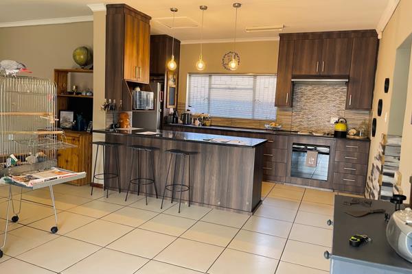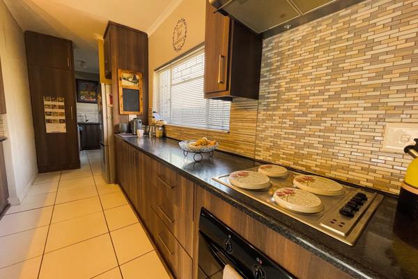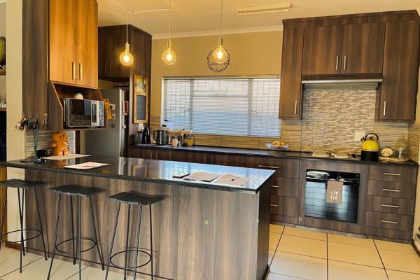 The heart of the home features amodern open-plan kitchen and loungewith dark wood cabinetry, granite countertops, a breakfast counter, and large windows that fill the space with natural light. Anautomatic sliding dooropens from the lounge to a covered patio that leads to asparkling swimming poolandbraai areacreating the ideal setting for relaxed weekends or easy entertaining.