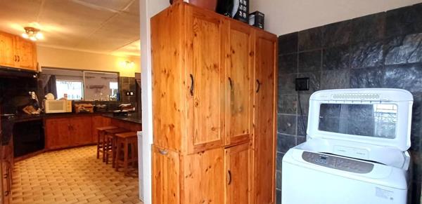 The kitchen is fitted with cupboards, tiled floors, and a pantry, and there is a separate scullery with space for a washing machine or dishwasher.
