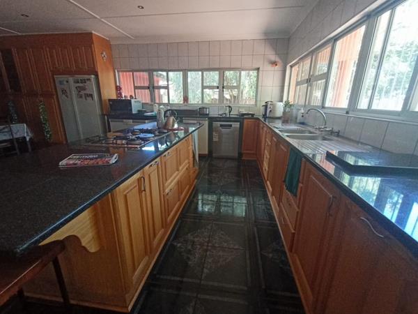 The large kitchen boasts a U-shaped design with a central island, dark granite countertops, and extensive light wood cabinetry, benefiting from abundant natural light. Multiple living areas include a lounge, dining room, and a dedicated study. Outside, enjoy a refreshing pool, lapa, and a well-maintained garden.