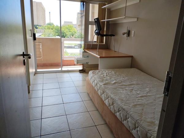 Each bedroom is thoughtfully designed with a single bed, study desk and chair, and ample built-in cupboards. A sliding door leads to an open balcony, providing fresh air and natural light.