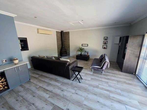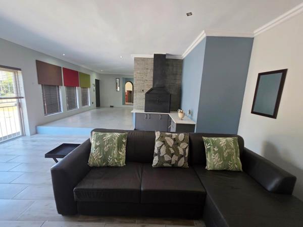 Entertaining is a highlight of this property, with a dedicated indoor entertainment room complete with a built-in bar and tiled floors. Sliding stack doors open onto a tiled veranda with a built-in braai, seamlessly connecting indoor and outdoor spaces.