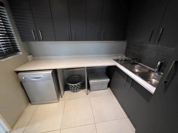 The kitchen is both practical and inviting, equipped with ample built-in cupboards, tiled flooring, blinds, a freestanding stove with gas hob and extractor fan, and connections for both a dishwasher and washing machine. A separate scullery adds valuable extra workspace and storage.