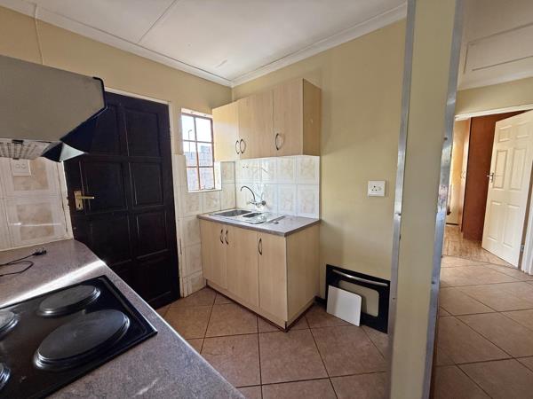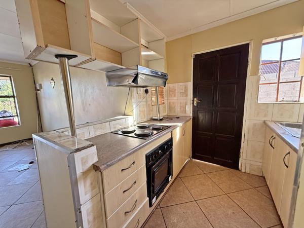 The open-plan lounge and kitchen provide a functional layout, with the kitchen featuring a built-in stove, oven, and built-in cupboards. With a bit of care and attention, this space could be transformed into the heart of the home.