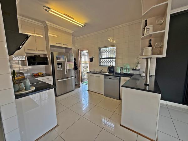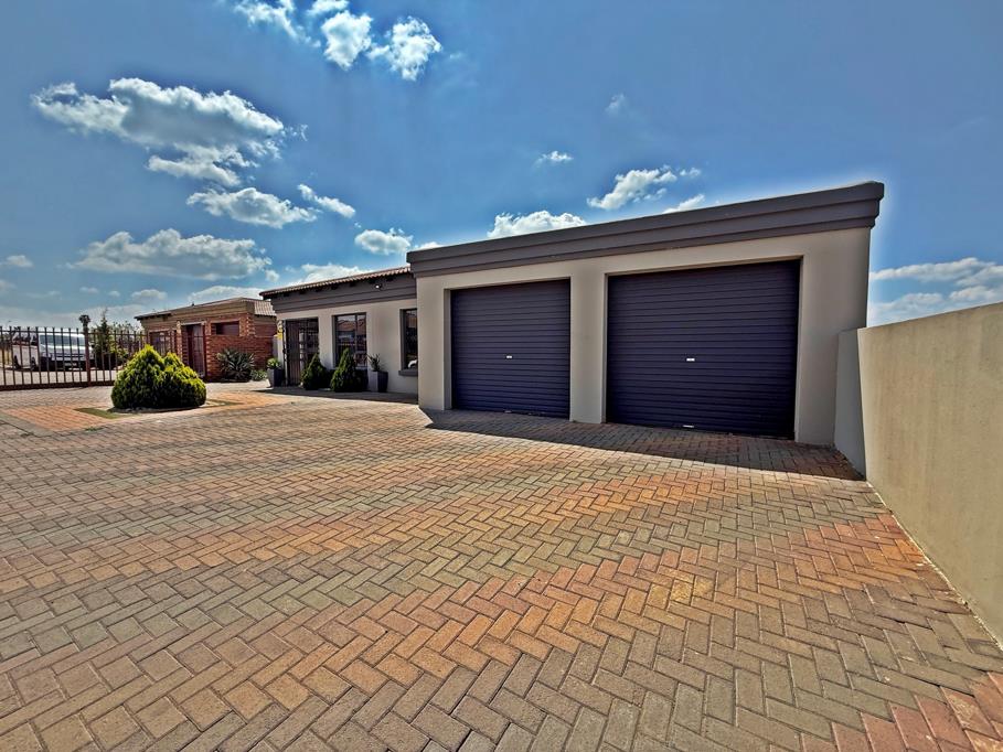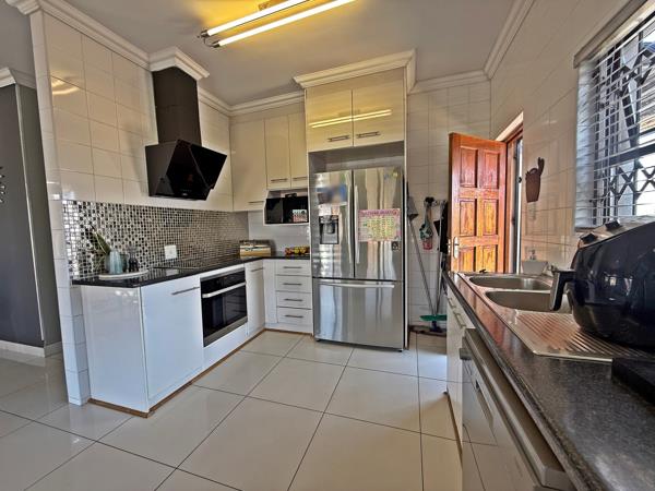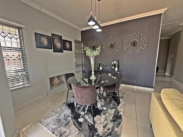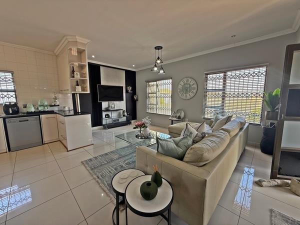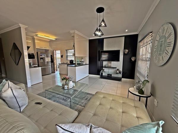 This beautiful property offers a seamless open-plan lounge, dining, and kitchen area perfect for modern living. The kitchen is fitted with built-in cupboards, a stove, and an extractor fan. There are three well-sized bedrooms and two bathrooms, providing comfort and convenience for the whole family. The home boasts a less is more design, giving it a clean and modern feel. Outside, youll find a decent-sized yard and a double garage for secure parking.