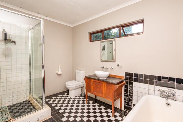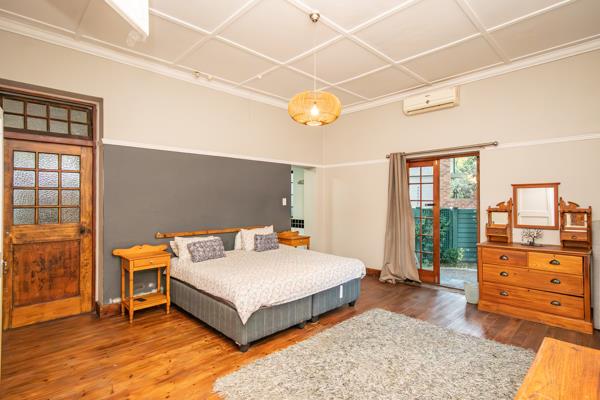 The home features three comfortable bedrooms. The main bedroom includes an en-suite bathroom, built-in cupboards, air-conditioning, a fireplace, and wooden flooring. The two additional bedrooms are fitted with built-in cupboards, underfloor heating, and laminated flooring, serviced by a second bathroom. Throughout the home, carefully selected feature tiles add charm and character.
