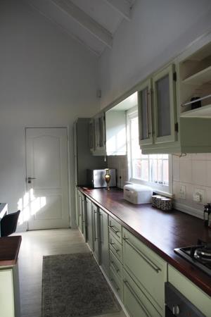 The living room features extra-high ceilings that enhance natural light, seamlessly flowing into an open-plan kitchen that boasts clean lines and modern finishes. A separate scullery keeps the main kitchen area uncluttered and functional.