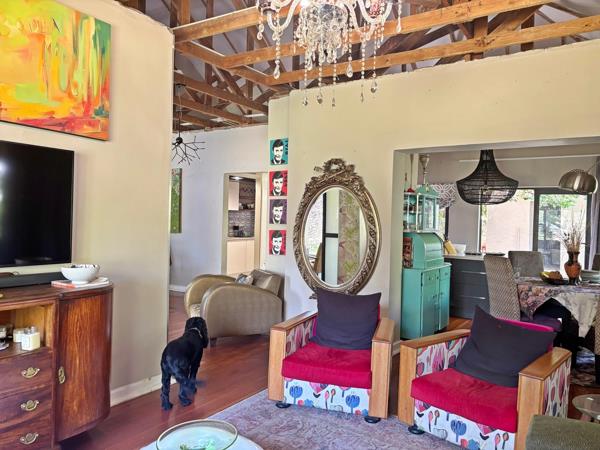 The home features 3 well-sized bedrooms and 2 bathrooms, complemented by an open-plan living and dining area that flows effortlessly into a modern kitchen with a separate scullery. The main living area is enhanced by beautiful exposed beams, adding warmth and character.
