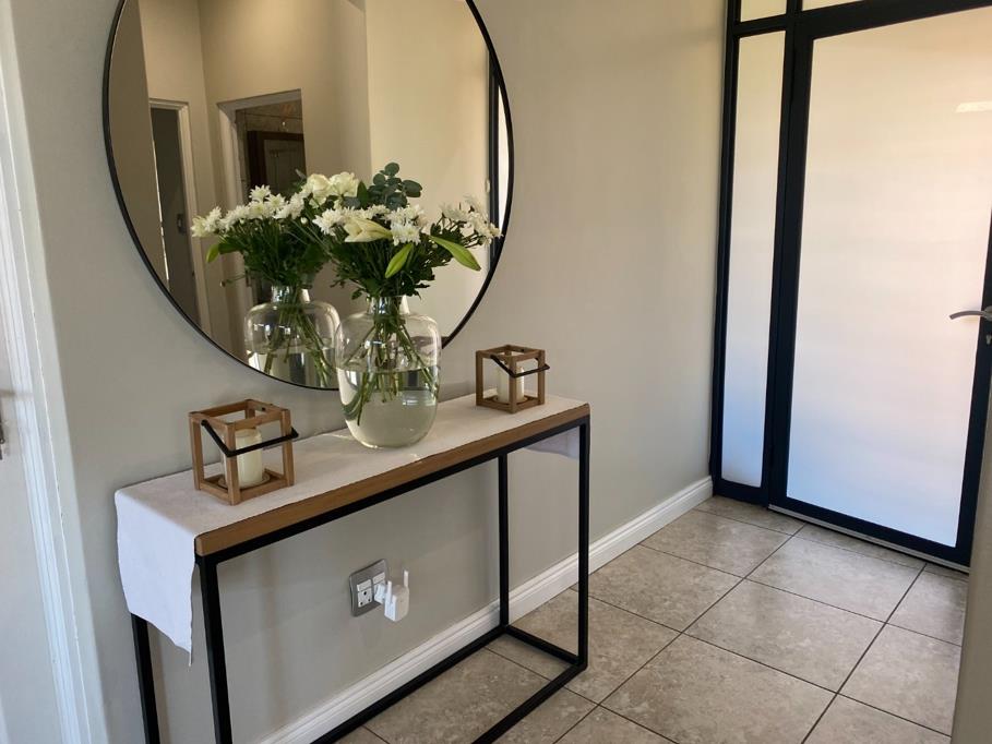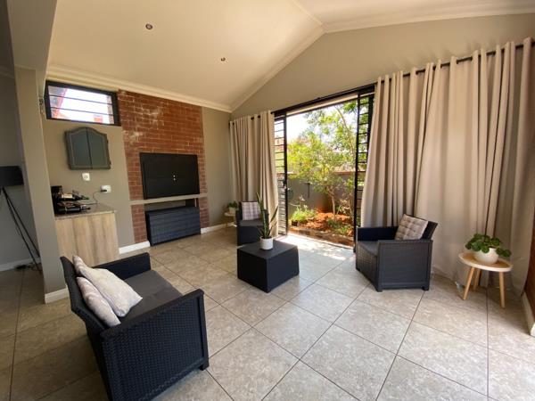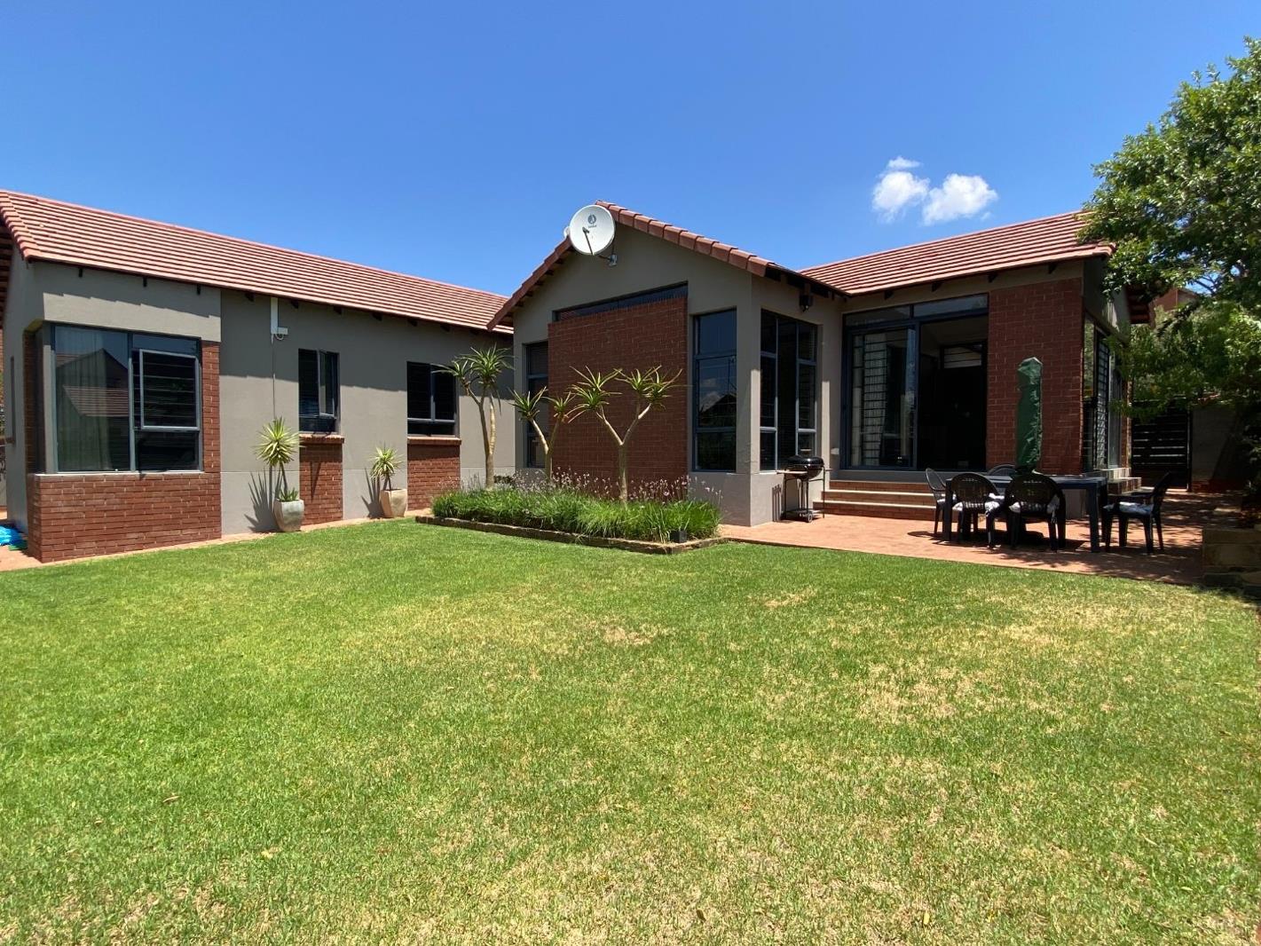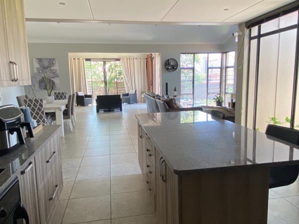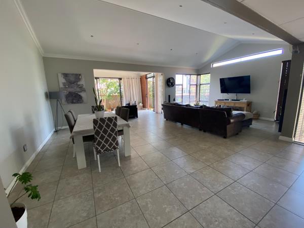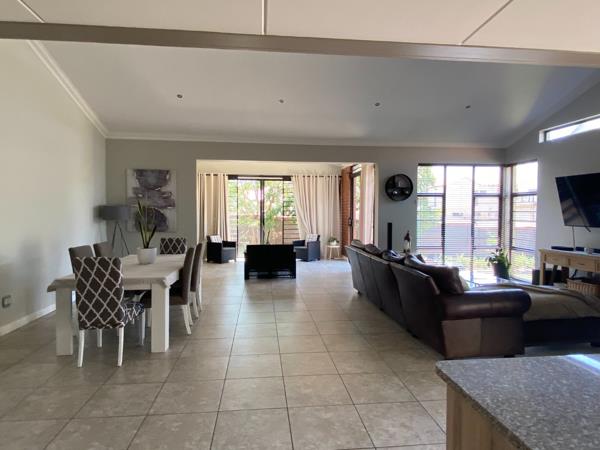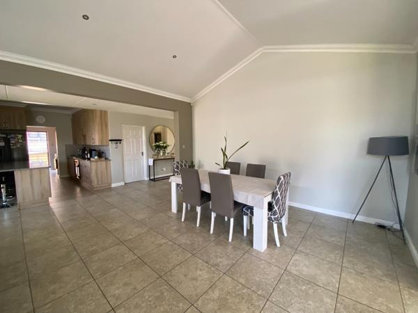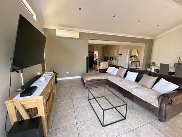 This spacious 4 bedroom family home is in a safe estate within walking distance from a shopping mall and a green area where you can hike, jog and cycle. It consist of 4 bedrooms, 3 bathrooms, one bedroom can be used as a study. Open plan lounge/dining room to braai room with built in braai and sliding doors to the garden. Modern kitchen with centre island is part of the open plan entertainment area. Separate scullery with cupboards and connections for appliances. The main bedroom with a full en-suite bathroom and the other two share a full bathroom. At the other side of the living area you get your guest bedroom with own bathroom with a shower. The flooring is tiles throughout the house. Blinds form part of the interior. Air con in living area. Double garage with electric doors is connected to the house. Spectacular garden with boma to braai. Call the agent for private viewing.