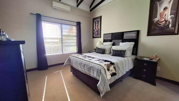The generous main bedroom offers ample cupboard space, air conditioning, and a luxurious full en-suite bathroom featuring a double vanity. Two additional bedrooms share a well-appointed full bathroom, ideal for family or guests.