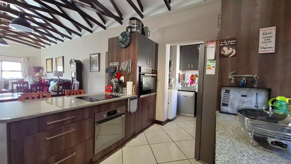 Step into a spacious open-plan living and dining area, enhanced by striking double-volume ceilings that create an airy, light-filled atmosphere. The modern kitchen boasts granite countertops, a hob, under-counter oven, and an eye-level oven, with a separate scullery for added practicality.
