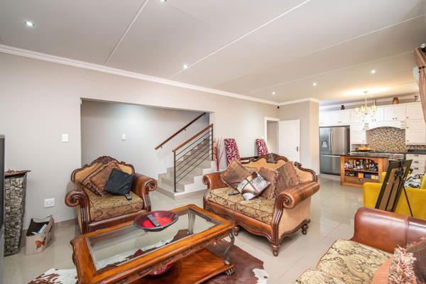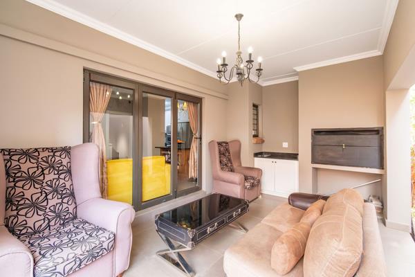 Step into an inviting open-plan living and dining area, enhanced by modern chandeliers, air-conditioning, and seamless flow to the patio with built-in braai. For added convenience, a guest toilet with basin is neatly tucked near the dining area. The kitchen is a chefs delight, featuring granite countertops, a gas stove, and a separate scullery.