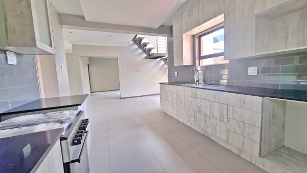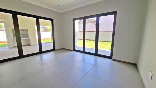 This modern home features a spacious open-plan living and dining area, enhanced by stacking doors that flow seamlessly onto a private patio with a built-in braaiperfect for effortless entertaining. Modern kitchen with scullery. A guest bathroom adds to the convenience on the ground floor.