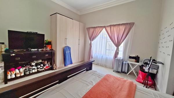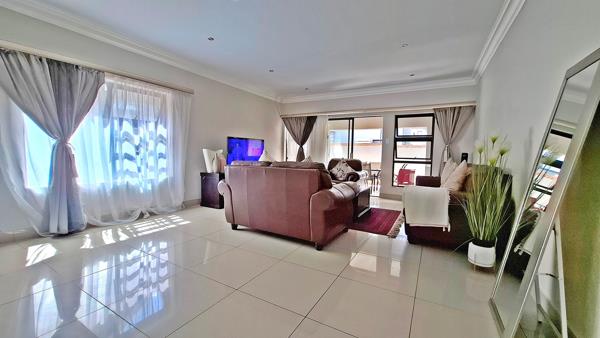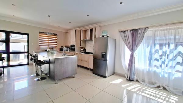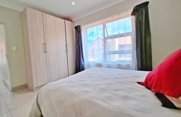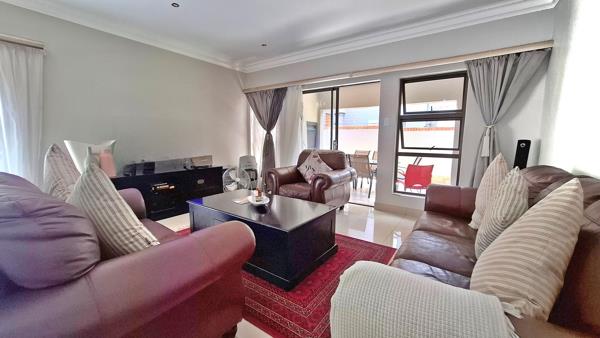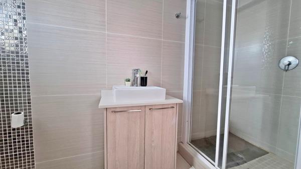 This modern double storey townhouse features a spacious openplan living and dining area, seamlessly flowing through sliding doors to a covered patio with a built-in braaiideal for entertaining.