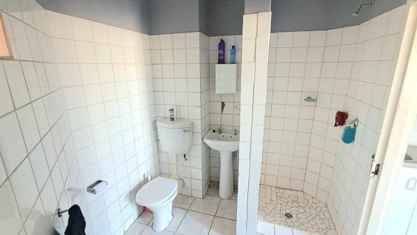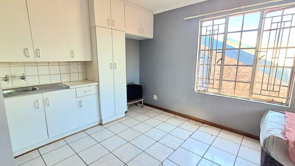 The bathroom is fully tiled and includes a shower, toilet, and basin. For added peace of mind, the property is secured with a security gate and burglar bars, making it ideal for safe and relaxed living.