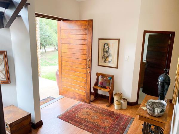 The living area is enhanced by a wood-burning fireplace, adding warmth and charm during winter, while underfloor heating throughout the home ensures comfort all year round. Ample storage space caters for hobbies and crafts, and the property also includes domestic quarters with a private bathroom.