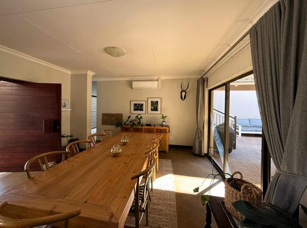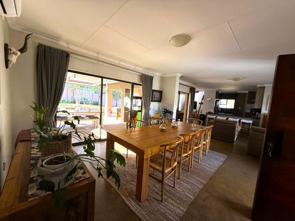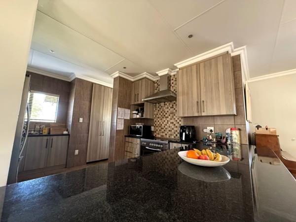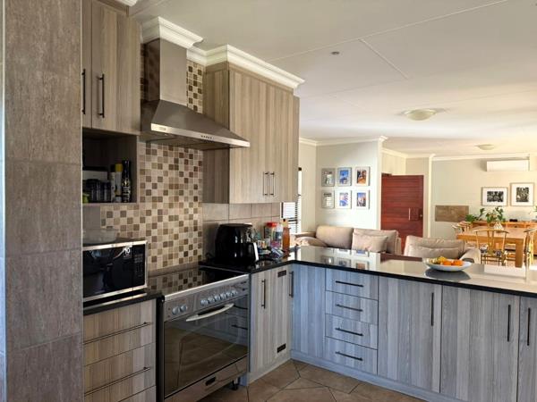 The open-plan kitchen, dining, and living area forms the heart of the home, complemented by a large scullery with space for all appliances. Sliding doors lead to a stylish braai area with an adjustable louvre roof, overlooking the pool and gardenperfect for entertaining.