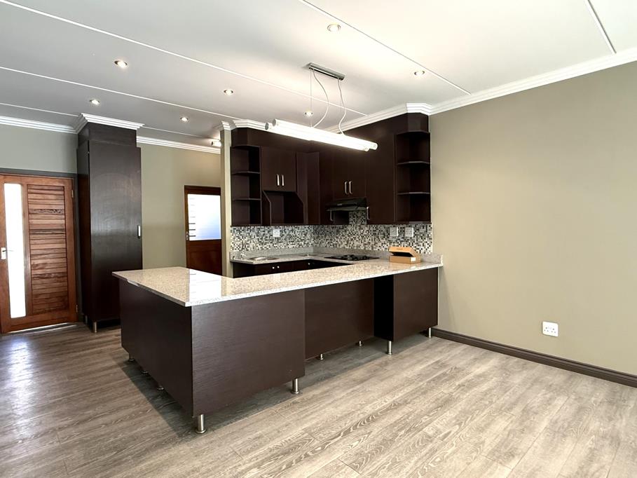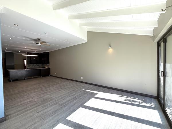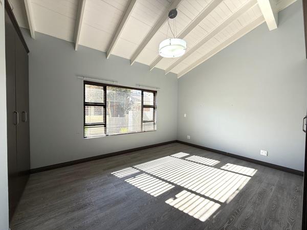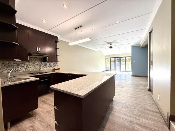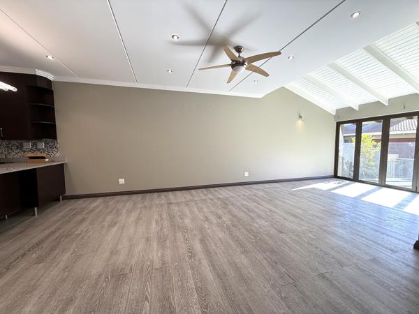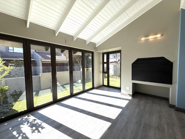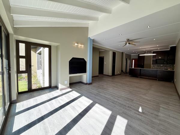 The property features three generously sized bedrooms and two stylish bathrooms, including a full en-suite in the main bedroom. A guest toilet on the ground floor adds further convenience for visitors. The open-plan design seamlessly integrates the lounge, dining area, and contemporary kitchen, creating a light and welcoming living space enhanced by laminated flooring and a built-in braai. Stack-away doors lead to a beautifully manicured garden, ideal for effortless indoor-outdoor entertaining or simply enjoying peaceful afternoons.