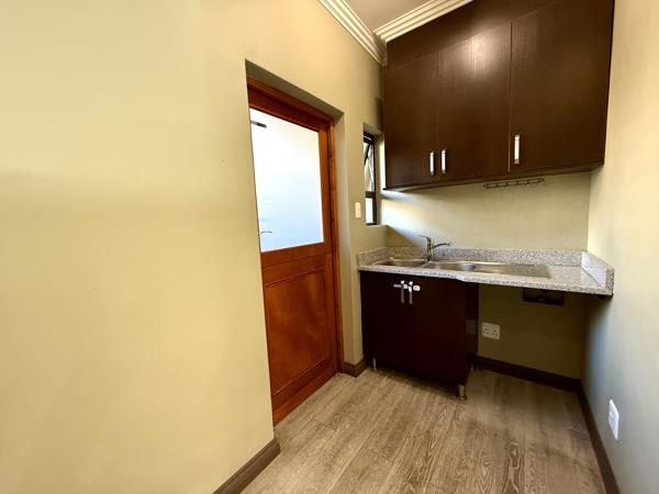 The modern kitchen is finished with granite countertops, ample cupboard space, and a separate scullery to ensure practicality and ease of living.