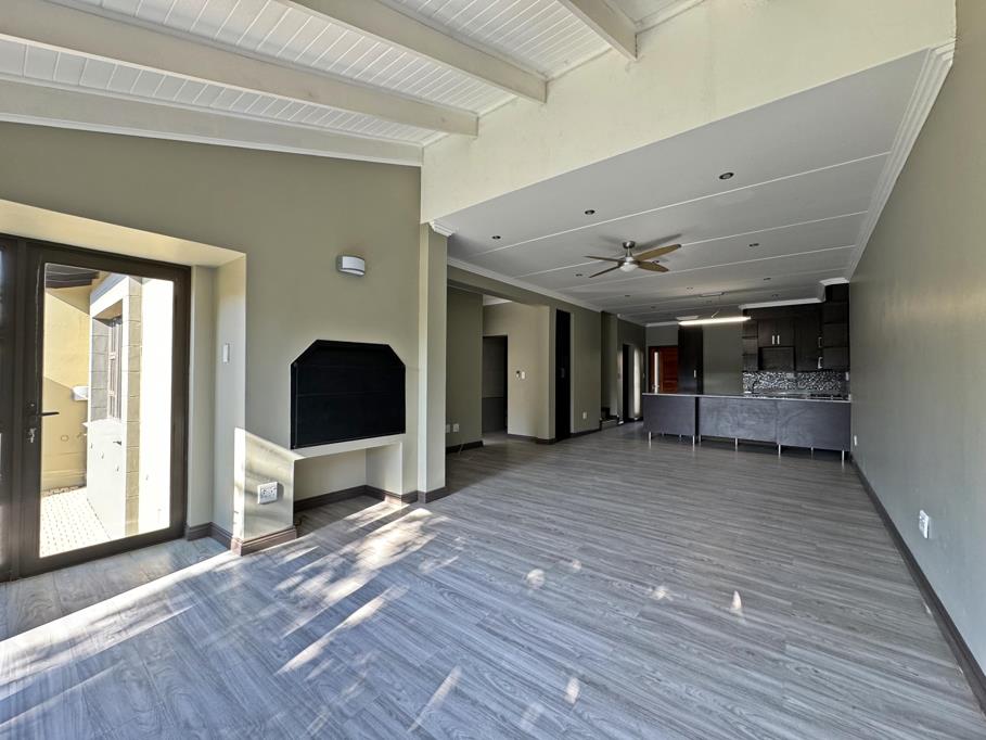 The spacious open-plan living and dining area sets the tone for modern living, seamlessly connecting to an entertainment room with a built-in braai and large stacking doors that lead to a beautifully landscaped garden. Designed for both relaxation and entertaining, this indoor-outdoor space is a true highlight.